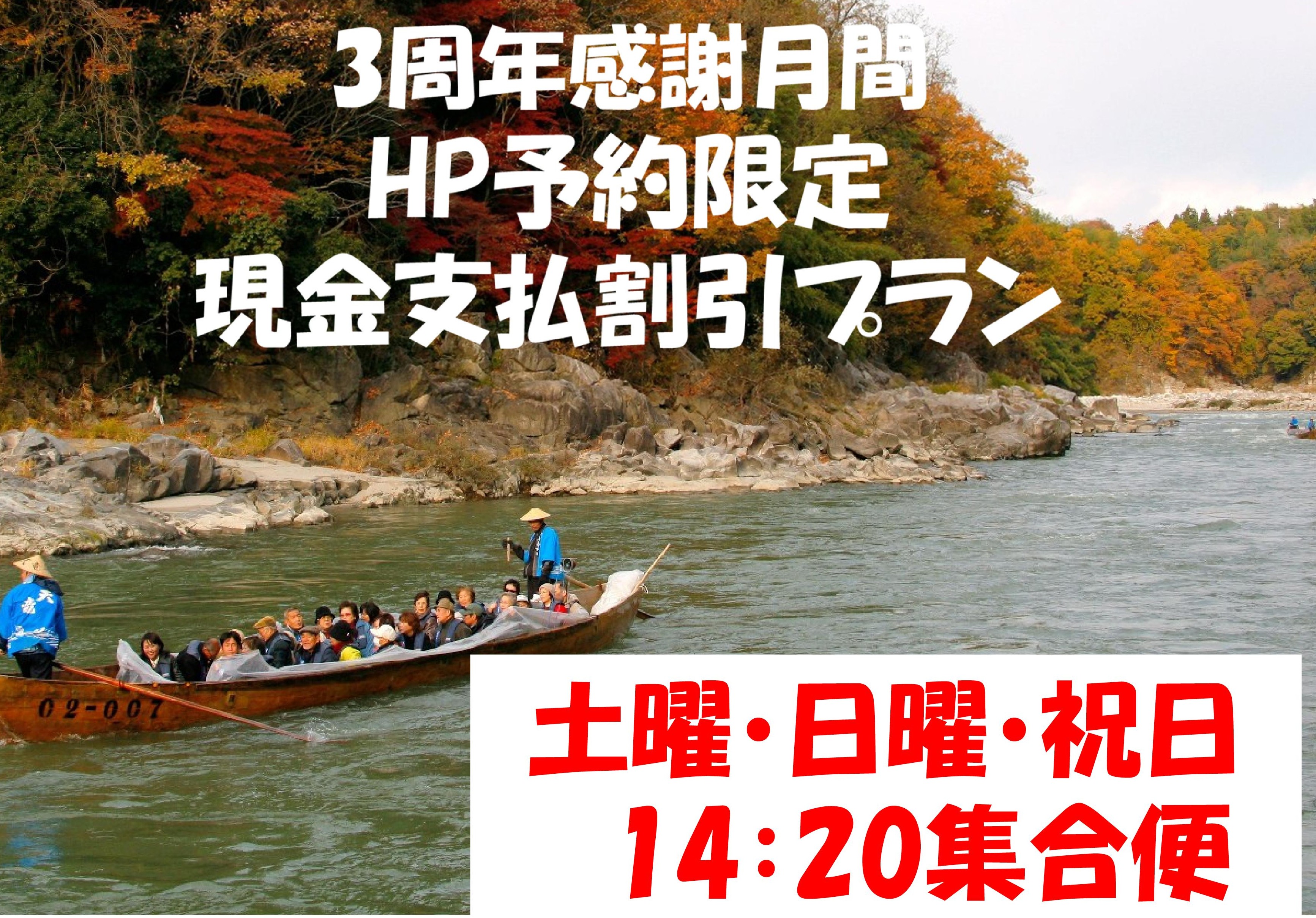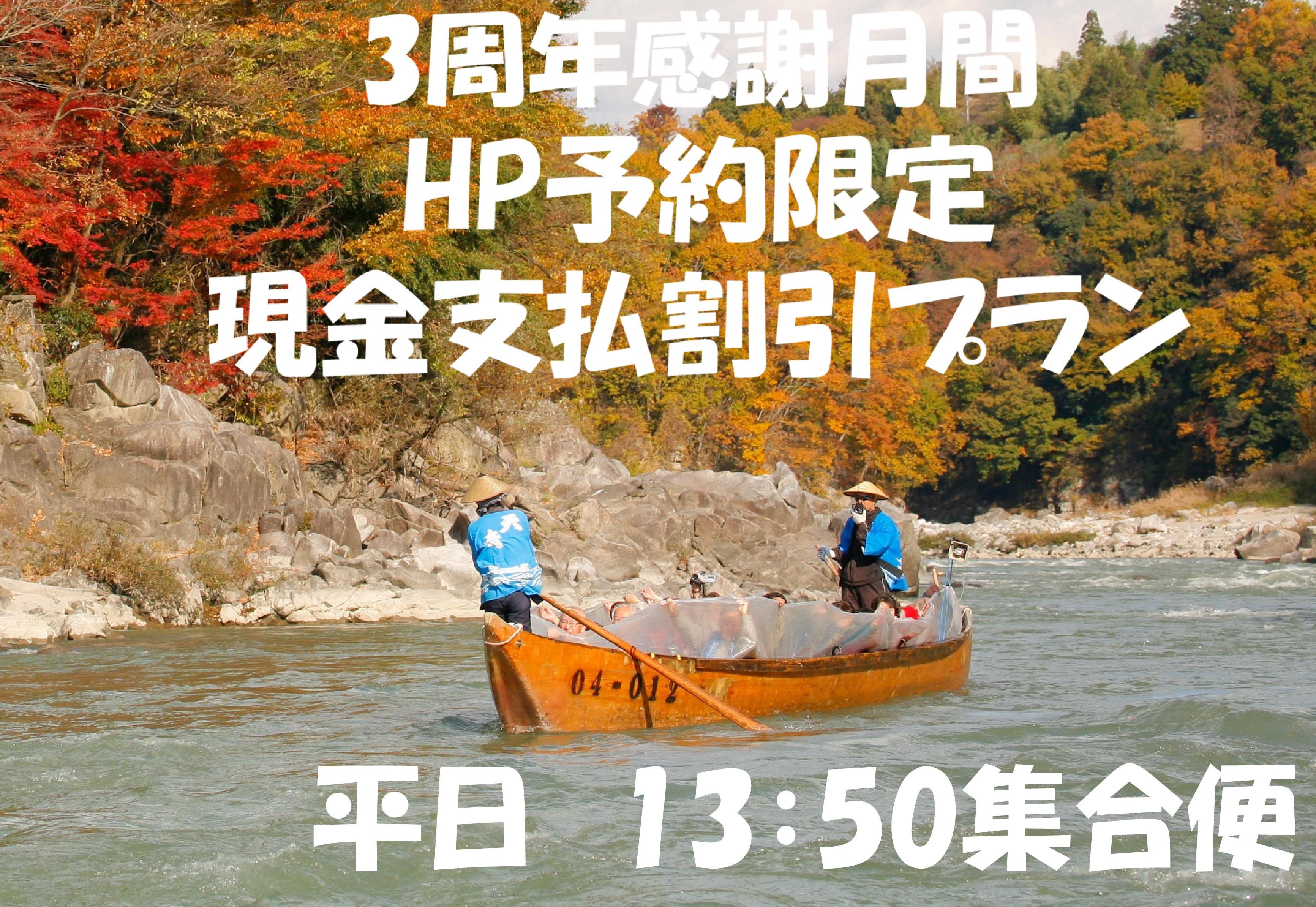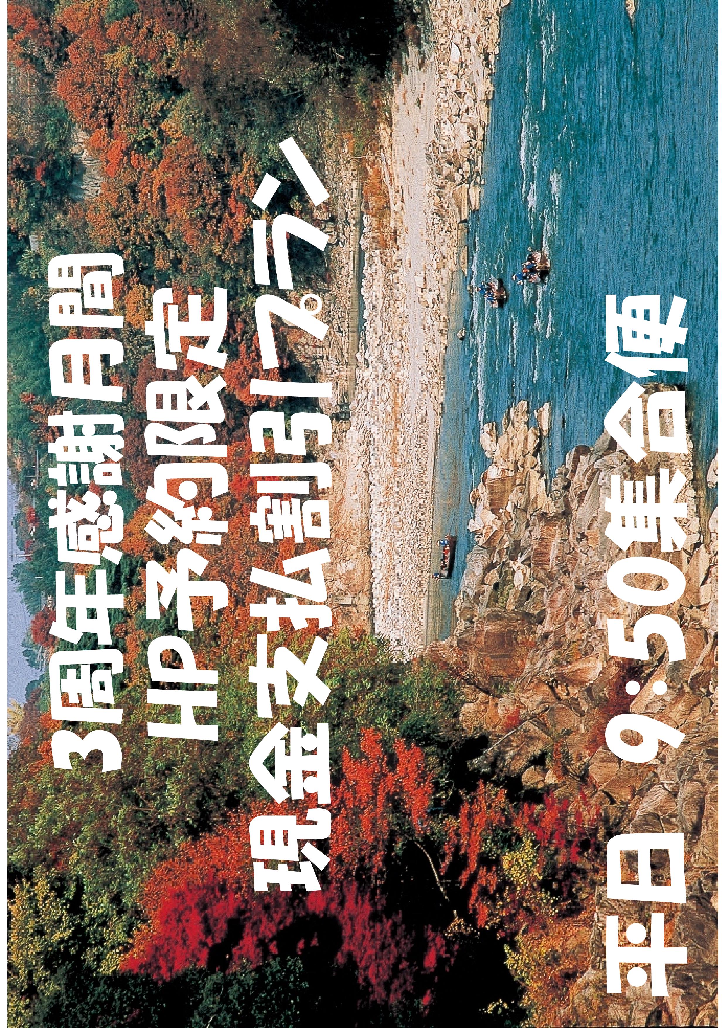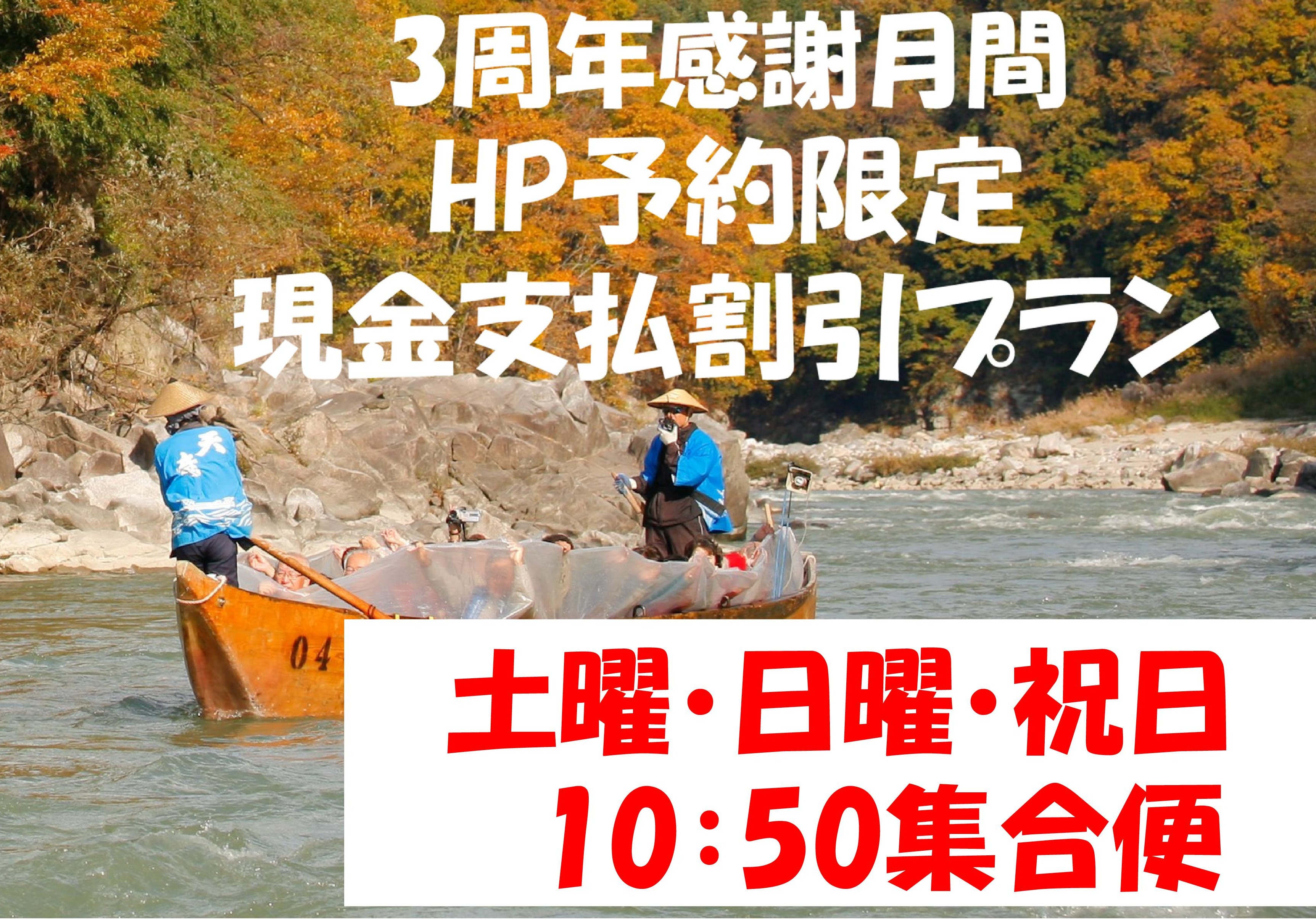 前日16:00まで受け付け。 HP予約限定 3周年感謝月間 現金払いでお得 10:50集合プラン 「現金で払うだけ」でちょっとお得!大人4500円を500円割引で4000円。 11月1日~30日の期間限定