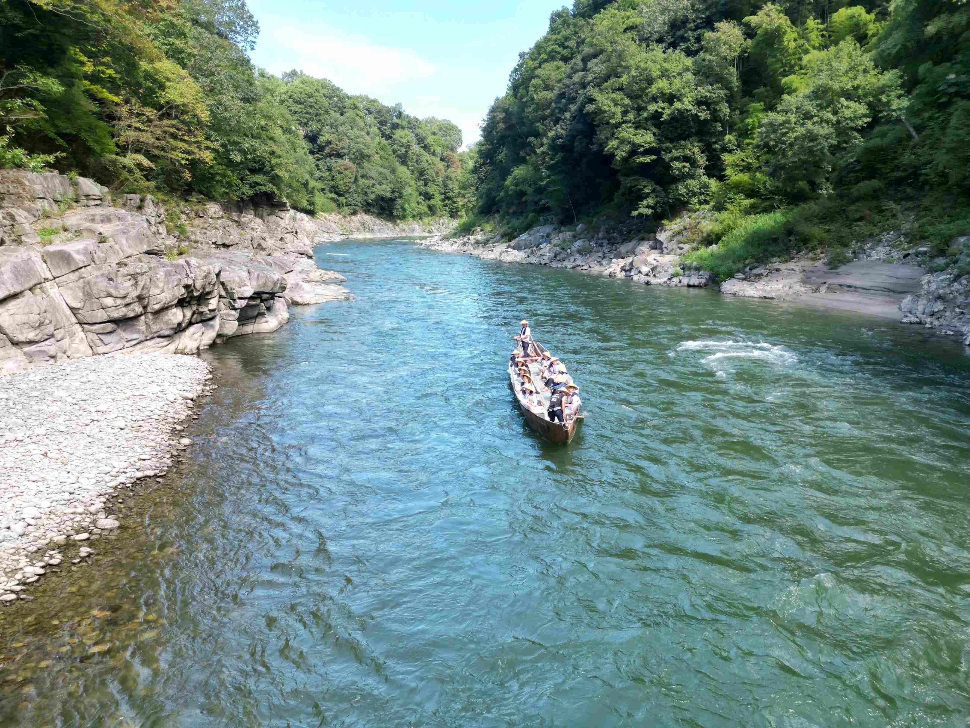時には瀬を下るごとに水しぶきと歓声があがる爽快な舟旅へようこそ。