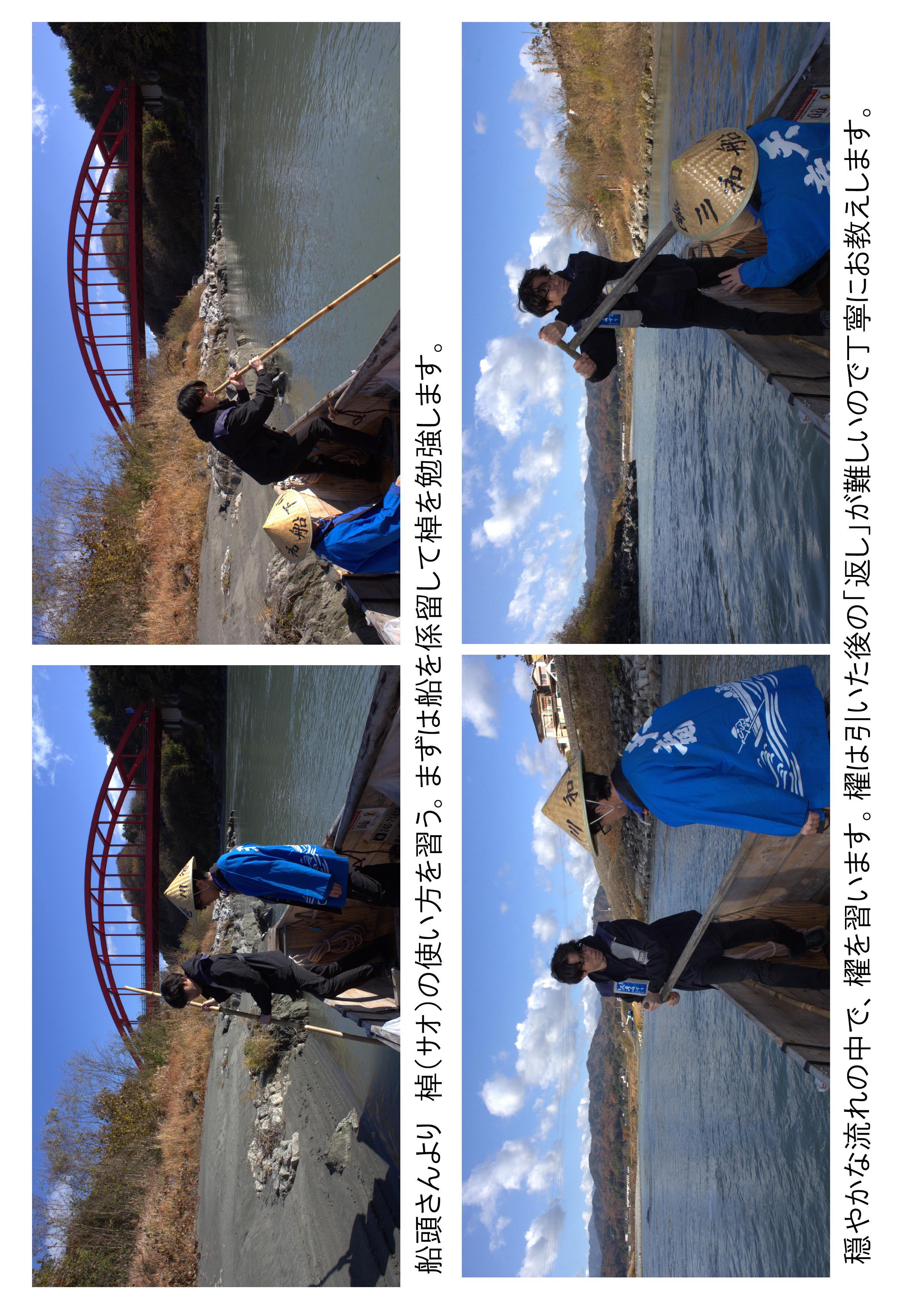天竜川和船下りの新商品のクルーズ船で時又周遊コースを体験 「上る」「止まる」「下る」を体験! 船頭さんと一緒に「掉さし」「櫂を引く」を体験